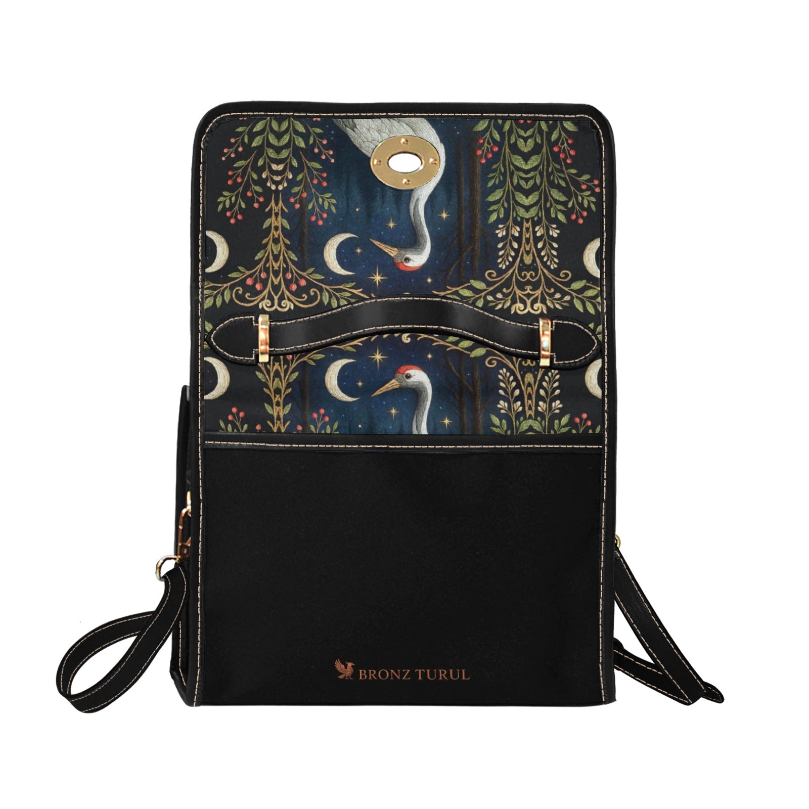 Lock cross body bag with the humble Crane (Daru). In Hungarian folklore, the Daru reminds us that strength is not always loud or fierce — sometimes it is found in patience, loyalty, and quiet protection.
