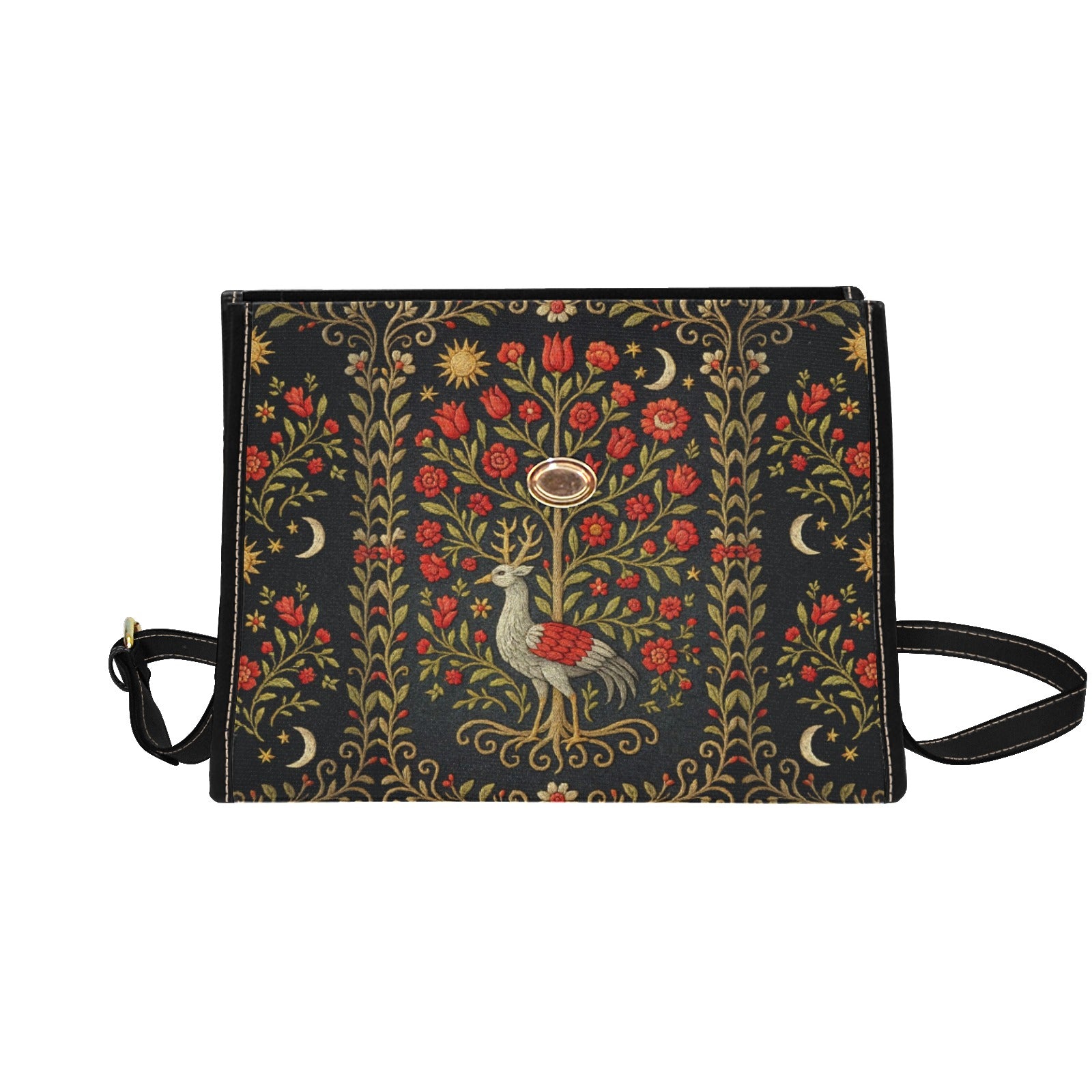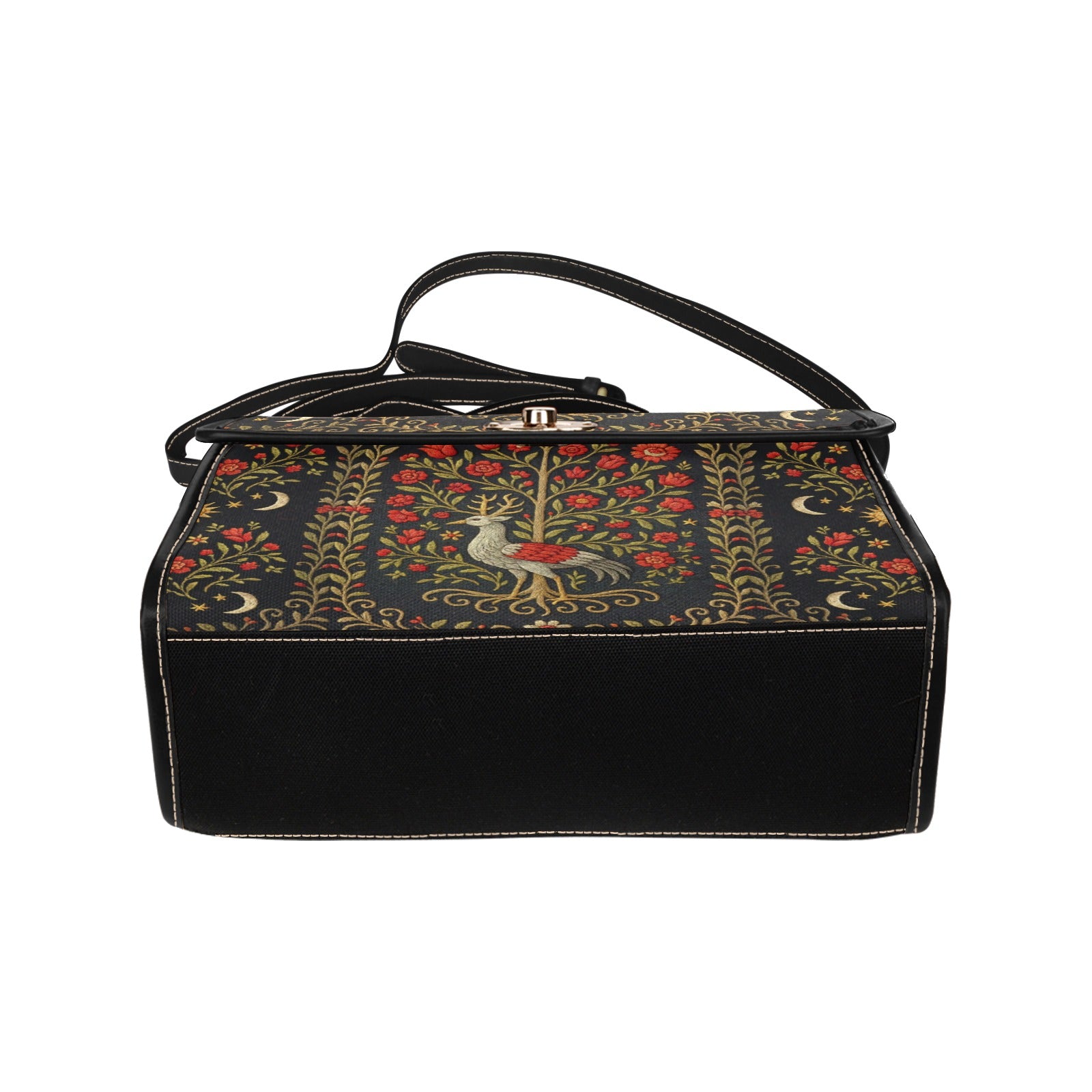 Lock cross body bag with the famous World Tree (Világfa) or Tree of Life (Életfa) that stands at the center of the world, connecting the Upper, Middle, and Under worlds in the Hungarian Mythology. Its foliage forms the Upper World where gods reside, its trunk is the earthly Middle World of humans, and its roots anchor the Underworld.